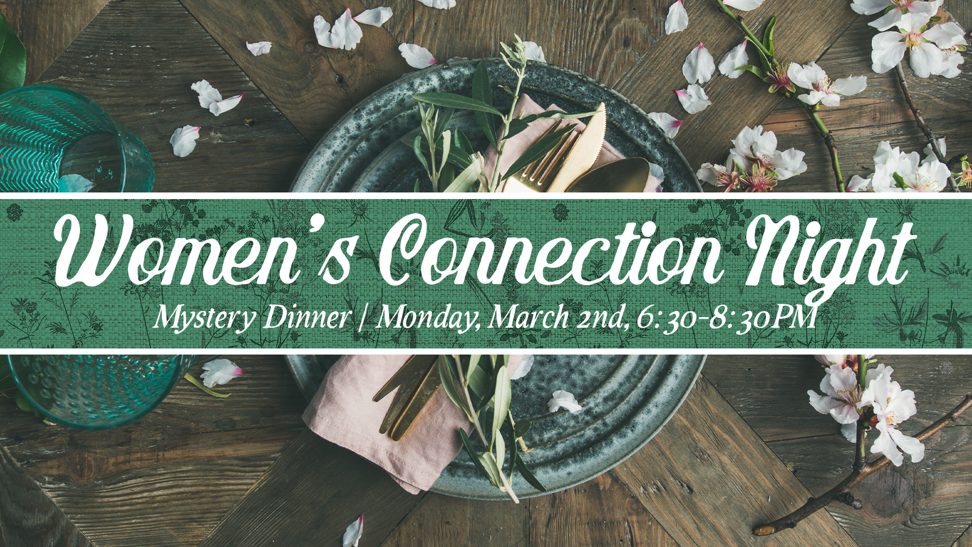 You're invited to Women's Connection Night: Mystery Dinner! Join us for an unforgettable evening of fun, surprises, and meaningful connection.