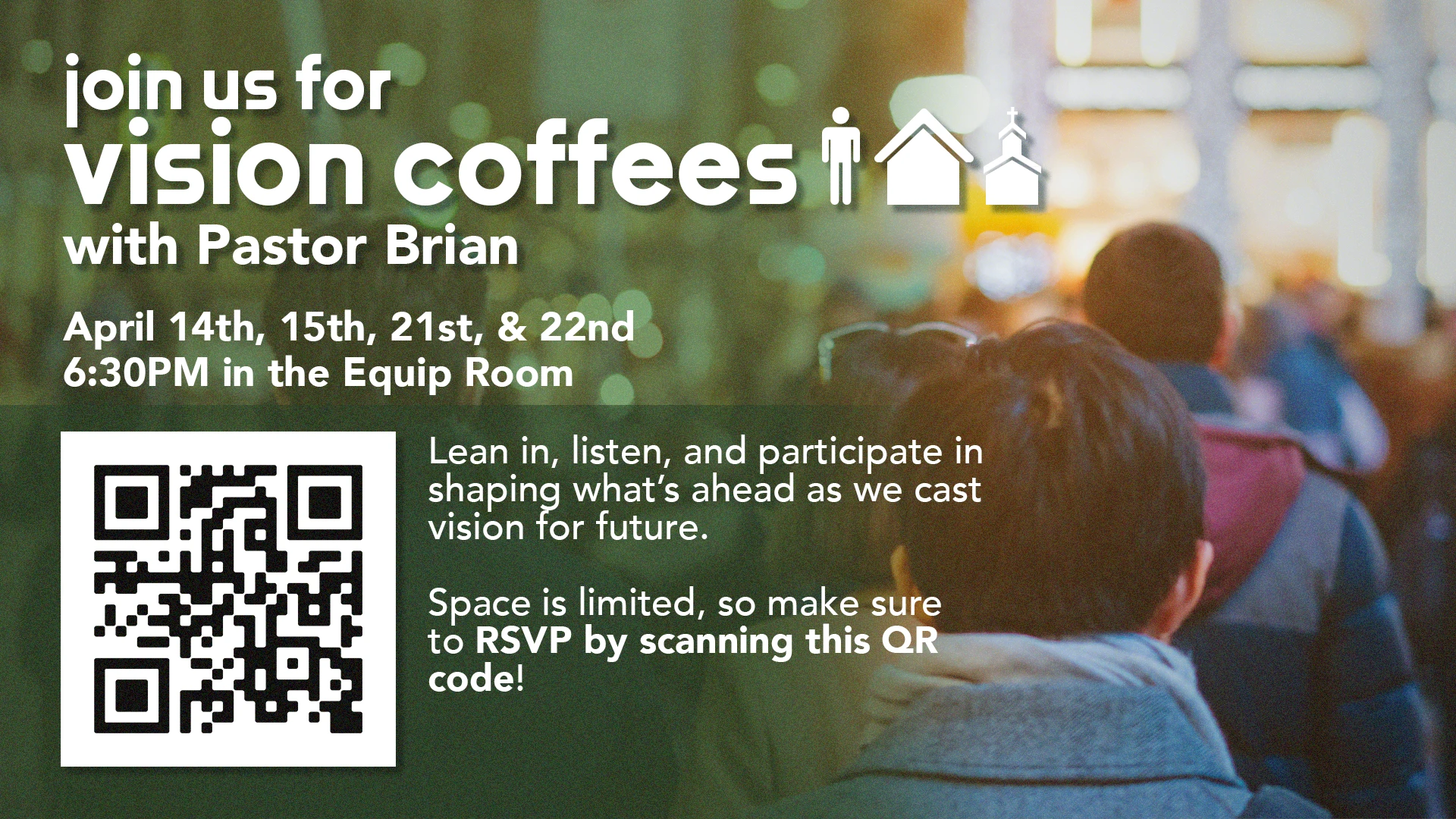 You’re invited to join us for a special evening on April 14, 15, 21, or 22 at 6:30pm in the Equip Room. We will be casting vision for the future at an upcoming Vision Coffee with Pastor Brian. These gatherings are designed to bring smaller groups together in an intimate setting to hear more about where God is leading our church, engage in meaningful dialogue, ask questions, pray together, and consider how each of us can take next steps in supporting the important initiatives ahead. Space is limited, so make sure to RSVP by registering for this event!